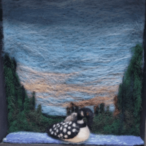 Learn the art of needle felting and create your own loon picture in this fun one-day workshop! Juried artist Patsy Fraiser will guide students as they felt a 5×5 inch shadow box that can sit on a shelf or hang on the wall. Create a 2.5-dimensional picture with a loon on the pond surrounded by cattails and greenery. This project is sure to be fun for felters of all experience levels.